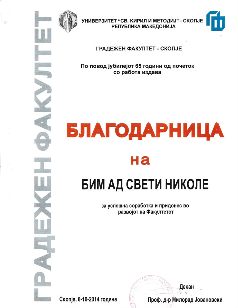 По повод јубилејот 65 години од почеток со работа, градежниот факултет издаде Благодарница на БИМ…